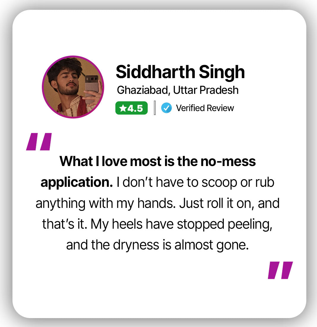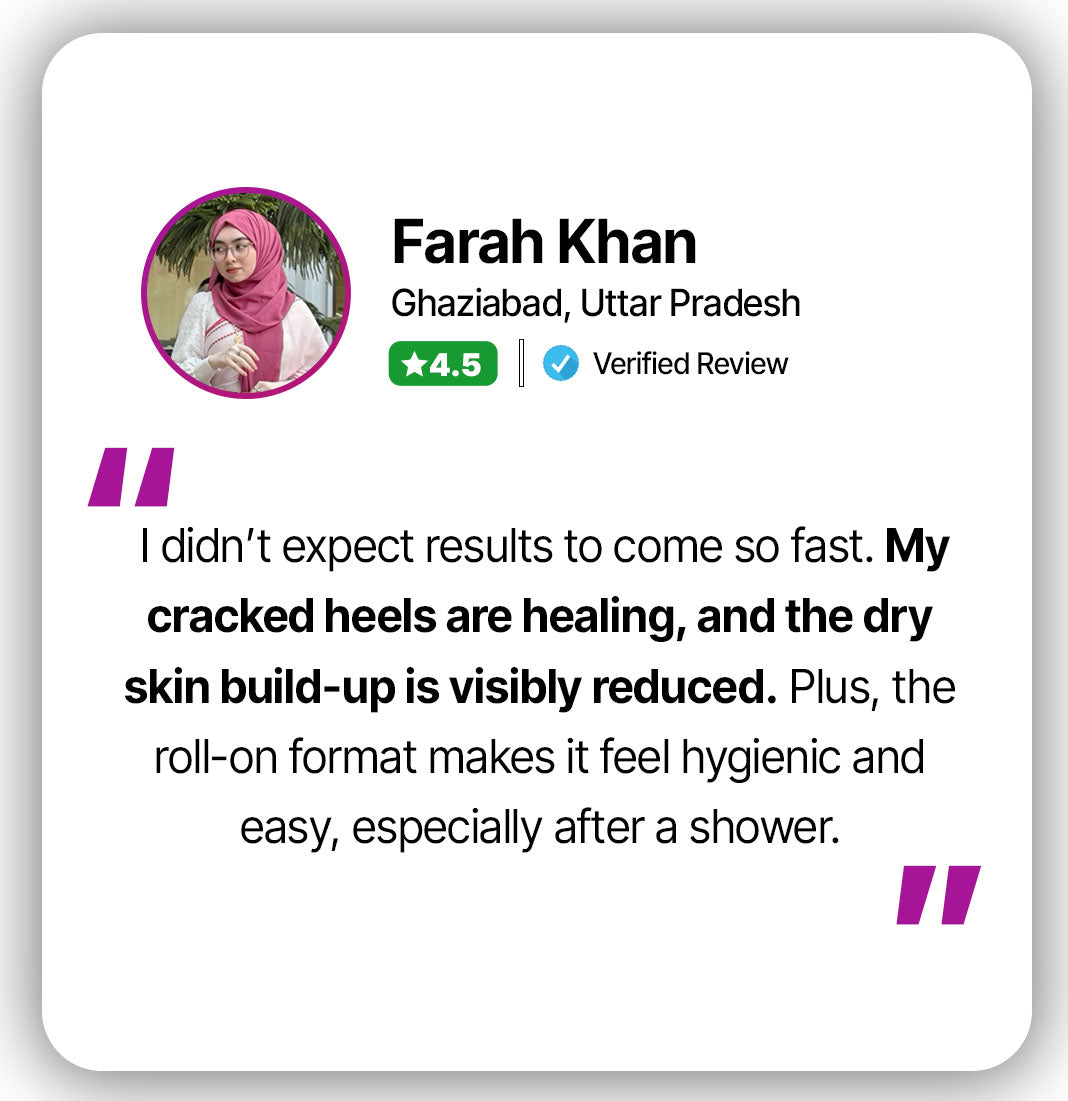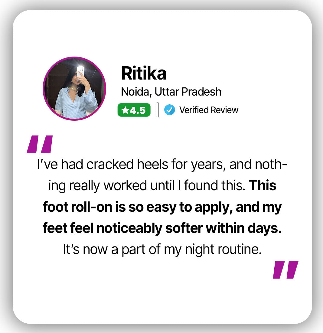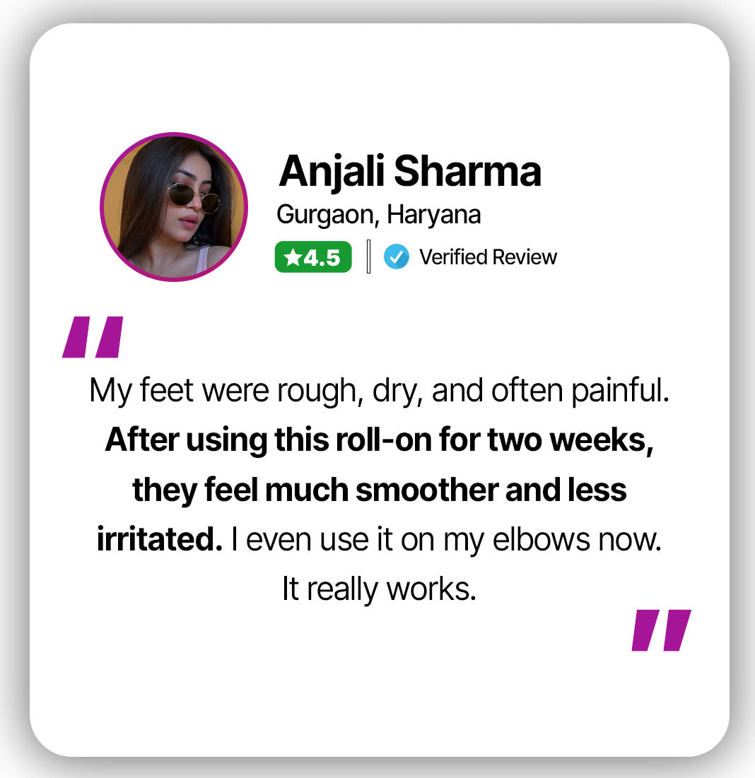 Unlike regular foot creams that sit on the surface, our Foot Roll-On delivers deep, targeted care. With 20% Urea and 2% NMF Complex, it softens thick, rough skin and repairs cracks from within, offering real, lasting relief. Additionally, the mess-free roll-on applicator makes it easy and hygienic to use at any time.