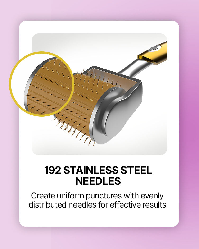 Meticulously designed to address hair growth challenges and enhance skin health, this derma roller features 192 stainless steel needles, each measuring 1mm. It offers a non-invasive solution to stimulate your hair follicles, improve scalp circulation, and boost the efficacy of topical treatments.